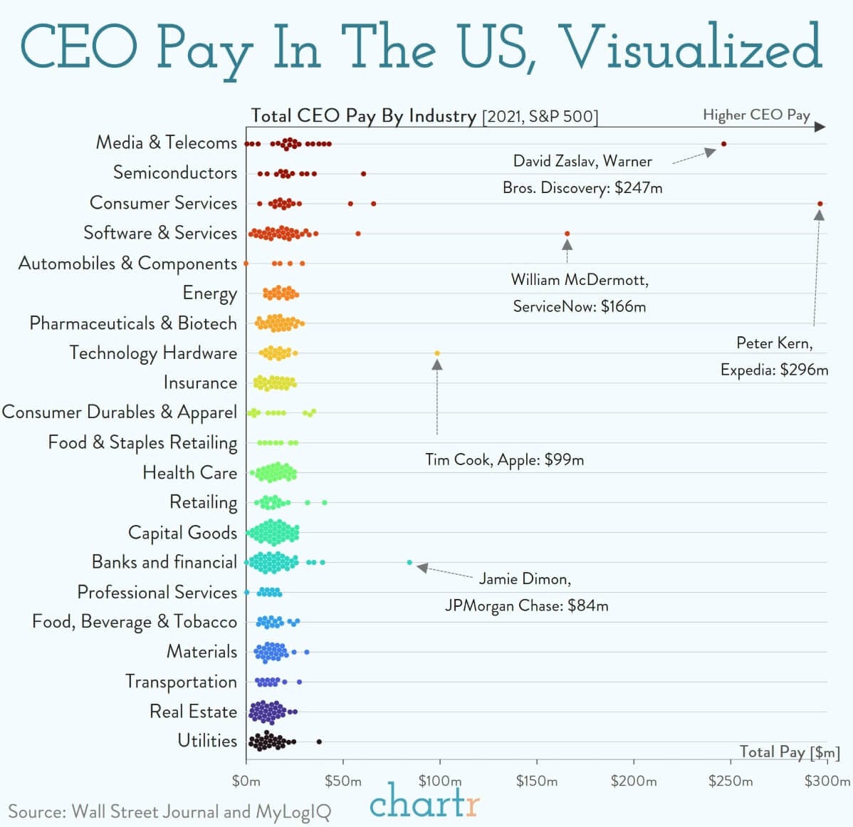 A nice infographic visualising CEO pay in the US. This data should be viewed in the light of shareholders in many companies voting against the massive compensation of major companies like Amazon, Intel, and JPMorgan.