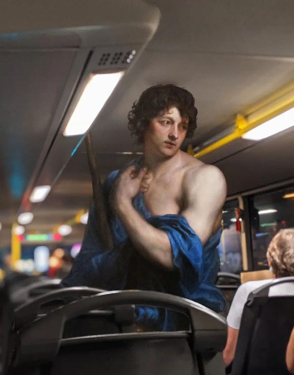 Alexey Kondakov juxtaposes contemporary consumerism and pop culture with characters from classical art by incorporating them into modern contexts.